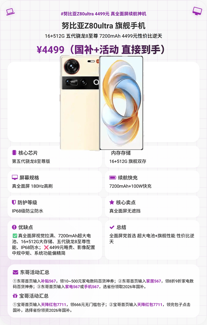 2. 努比亚Z80ultra(国补+活动到手价4499元)——推荐星级:★★★★☆(4星半)