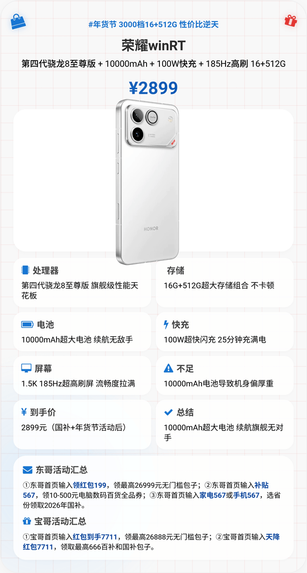 3000元档续航天花板,2899元16+512G存储,搭载第四代骁龙8至尊版芯片,16G LPDDR5X Ultra+512G UFS 4.1性能铁三角,安兔兔跑分出色,东风涡轮散热保障长时间游戏控温稳定。核心亮点是10000mAh青海湖巨无霸电池,重度使用能支撑两天一充,100W有线分钟满电,彻底告别电量焦虑。